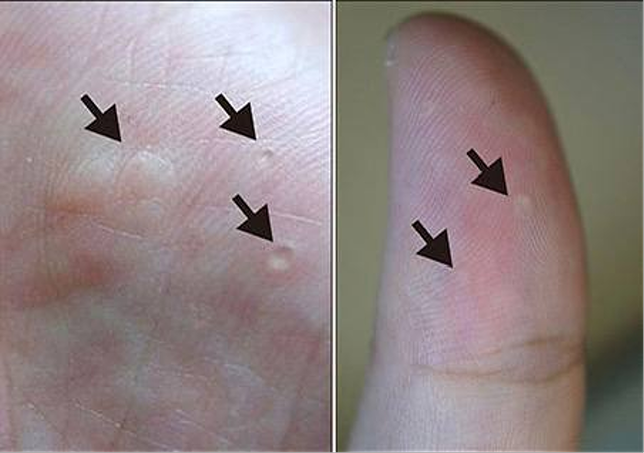- кожно-слизистые поражения (ладонно-подошвенный кератоз, трихилеммомы, папилломы, пигментированные макулы на половых органах)