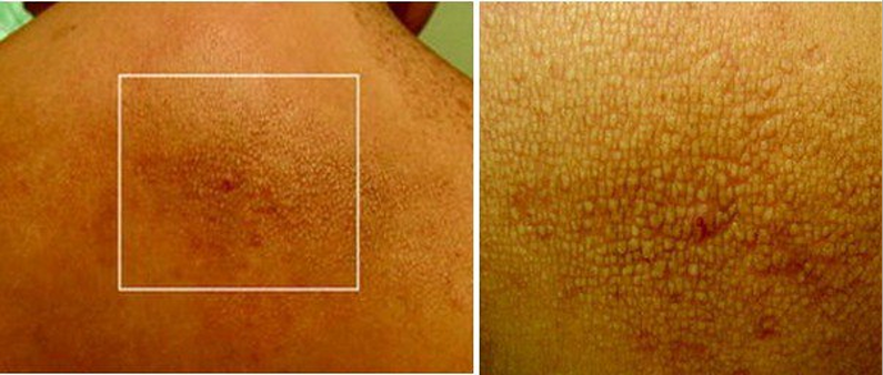 - кожный амилоидоз характеризуется дерматологическими проявлениями в виде зудящих шелушащихся папул, которые особенно заметны на спине, в области лопаток