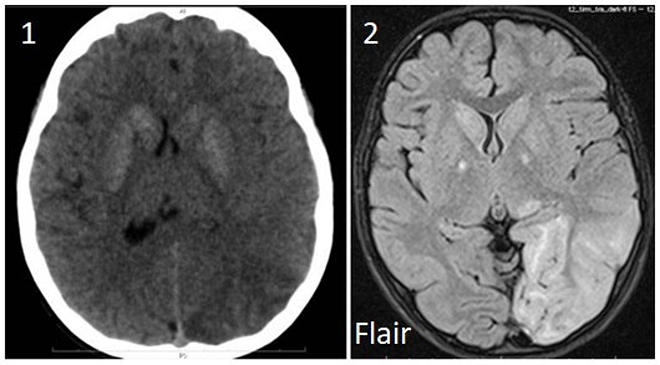 МРТ: очаги усиления сигнала в режимах Т2/ FLAIR (чаще в задних отделах мозга, не совпадающих с зонами васкуляризации крупных сосудов)